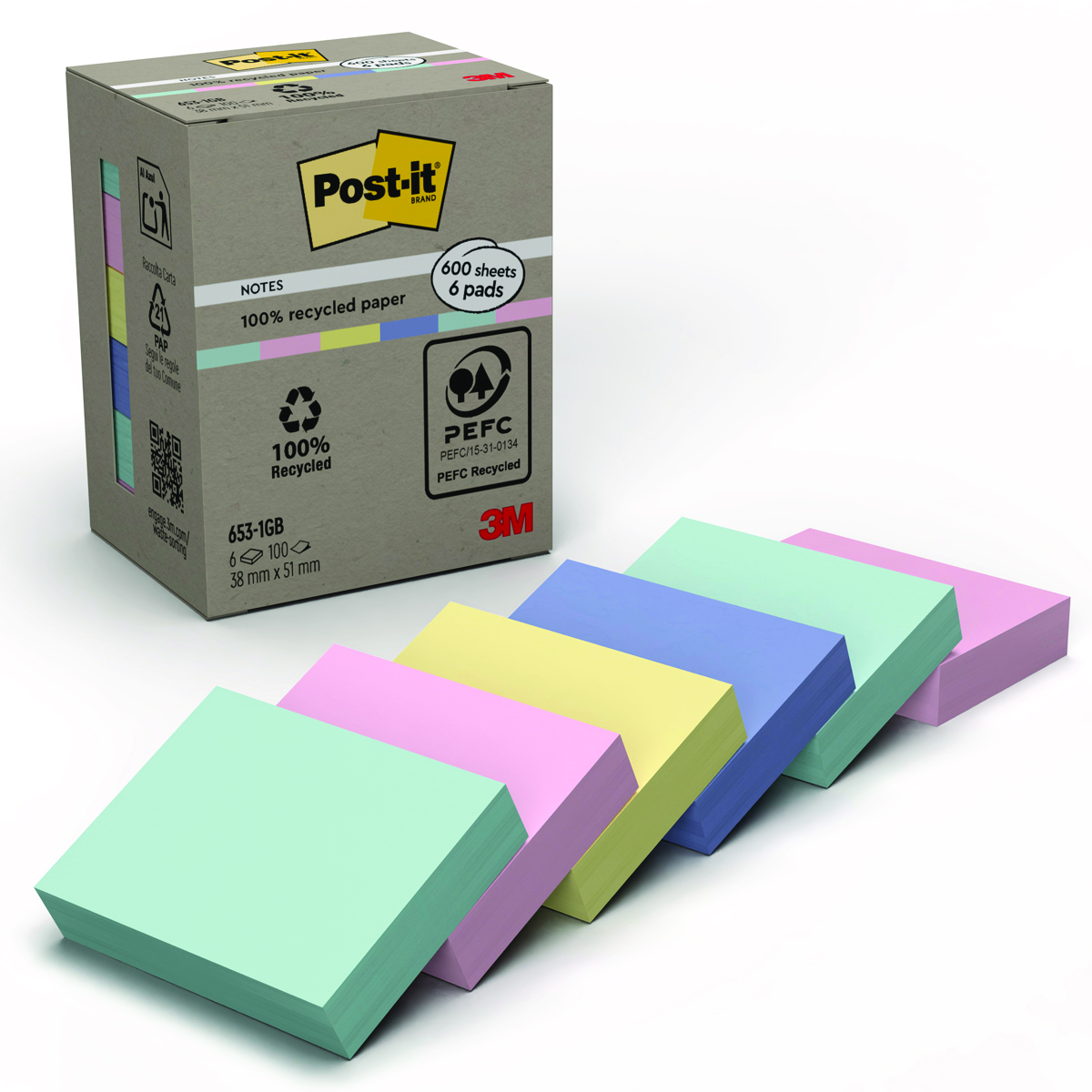 Karteczki samoprzylepne POST-IT® Recycled Notes, 38x51mm, 6x100 kart., pastelowe mix