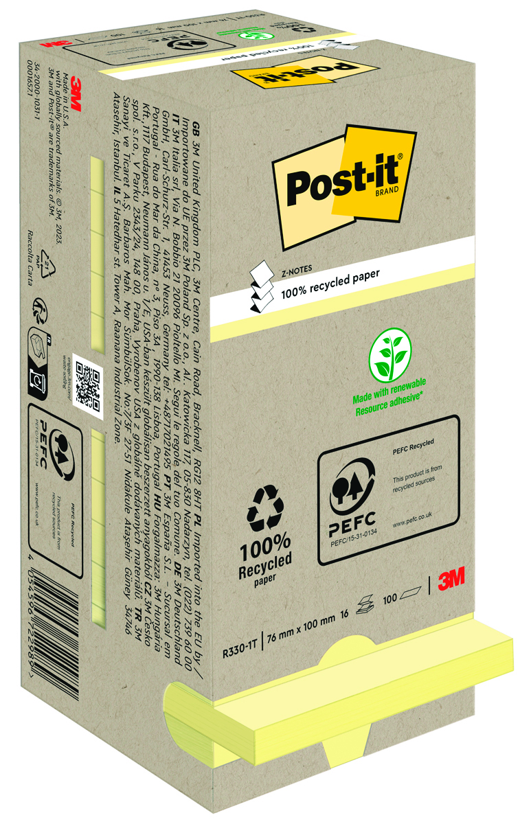 Karteczki samoprzylepne POST-IT® Recycled Z-Notes (R330-1T), 76x76mm, 16x100 kart., żółty