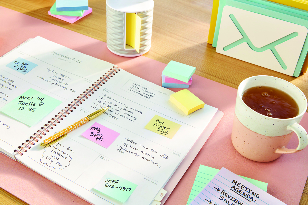 • karteczki samoprzylepne Post-it® wykonane w 100% z papieru pochodzącego z recyklingu
