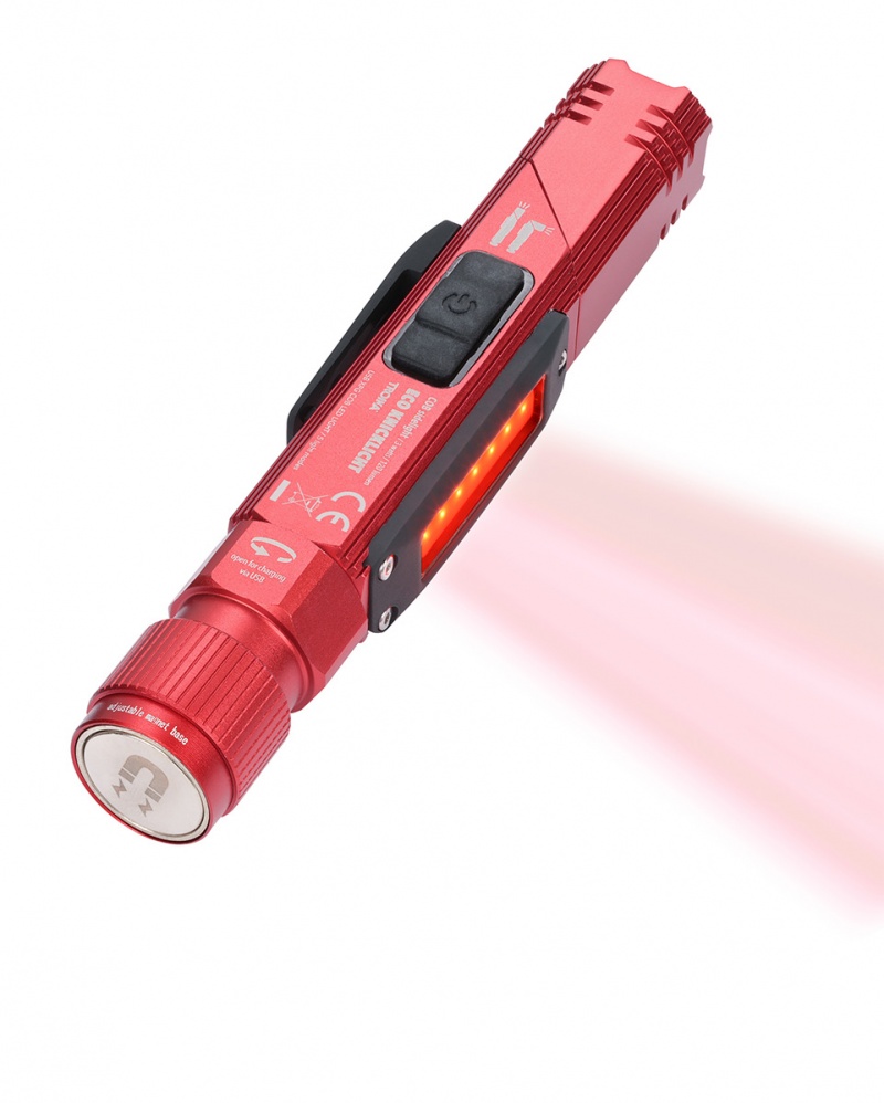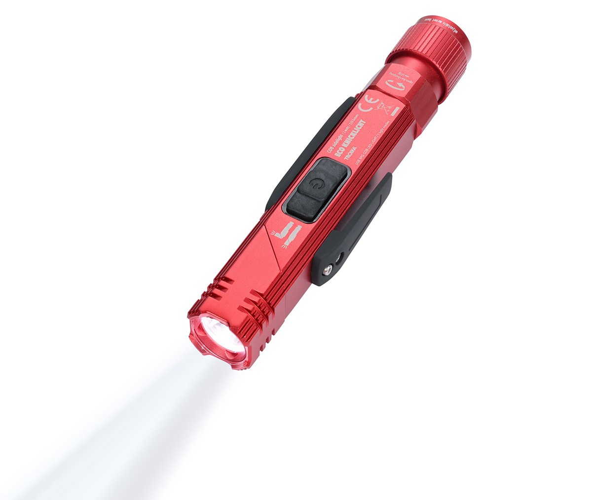 • diody LED COB z boku zapewniają 120 lumenów, zarówno w postaci białego światła do pracy, jak i czerwonego światła ostrzegawczego – z funkcją szybkiego migania